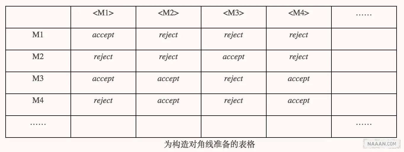 脑子再转一下,图灵机与图灵机之间没有什么一般化的关系,图灵机识别的是语言,是字符串,那么将标识列的图灵机换成描述图灵机的串,既保持了行列数一致性,又让行列交汇处有了非平凡的意义!即,用 M1, M2, M3…标识第 1 行、第 2 行、第 3 行……再用描述图灵机的字符串