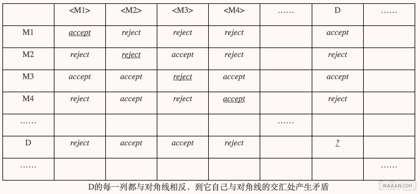 想必图灵深知语言集比图灵机集要「大」,一台图灵机只能对应一个语言,所以用对角线方法必定能构造出一个所有图灵机都不能识别的语言。这个语言就是 D「识别」的语言,则 D 的语言肯定不会出现在那个图灵机和对应语言的表格中。如果强行将这台「不存在的图灵机」安插进表格中,必然产生矛盾,矛盾就发生在 D 所在行与对角线的相交处。就像康托用对角线方法构造出来的那个实数无法插入到 [自然数 ->实数] 的映射表格中,否则构造出来的那个实数就与它自己矛盾了,神奇的「图灵机 D」就是这么来的。