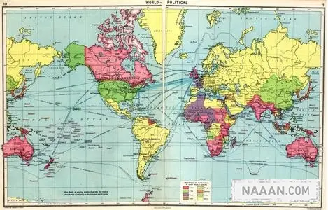 非洲大陆东北角上,那狭长的红海,和东南角上的马达加斯加岛,我都用红圈标注了出来。通过对比,这是一望而知的事情。两张图的区别在于,地图是在赤道上空看地球,而照片要偏南半球很多,以至于欧洲被挤到了图片之外,相反是南极洲在图片下方占据了大量面积。问题在于:各个国家习惯性地把自己国家置于地图的中心,例如下面英国出版的世界地图,和你平常看到的世界地图绝对不一样: