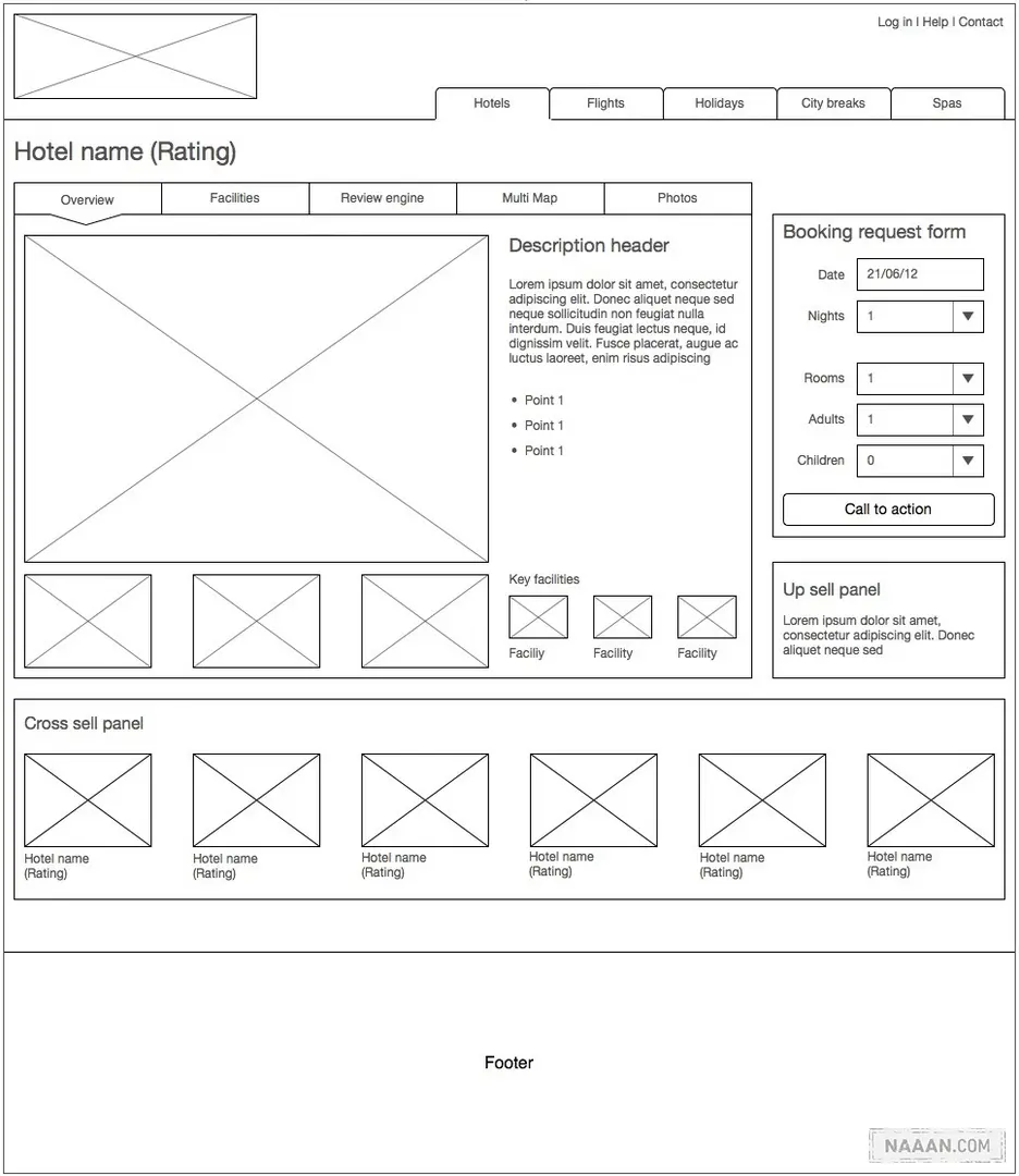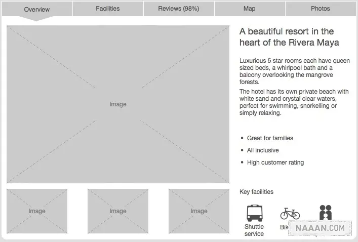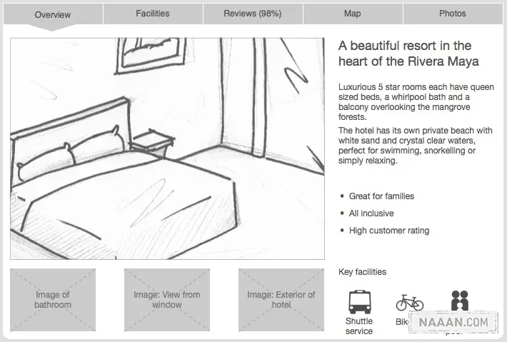 我们不必通过非常精细的绘画来为线框原型中的图片元素增加描述性,通过简单的草图来陈述出用户希望在这里看到的图片类型即可。例如,在提供酒店预定服务的网站中,用户通常希望在详情页里看到怎样的图片?房间?卫生间?景观?这些问题都是值得花时间了解清楚并在线框原型中加以体现的。