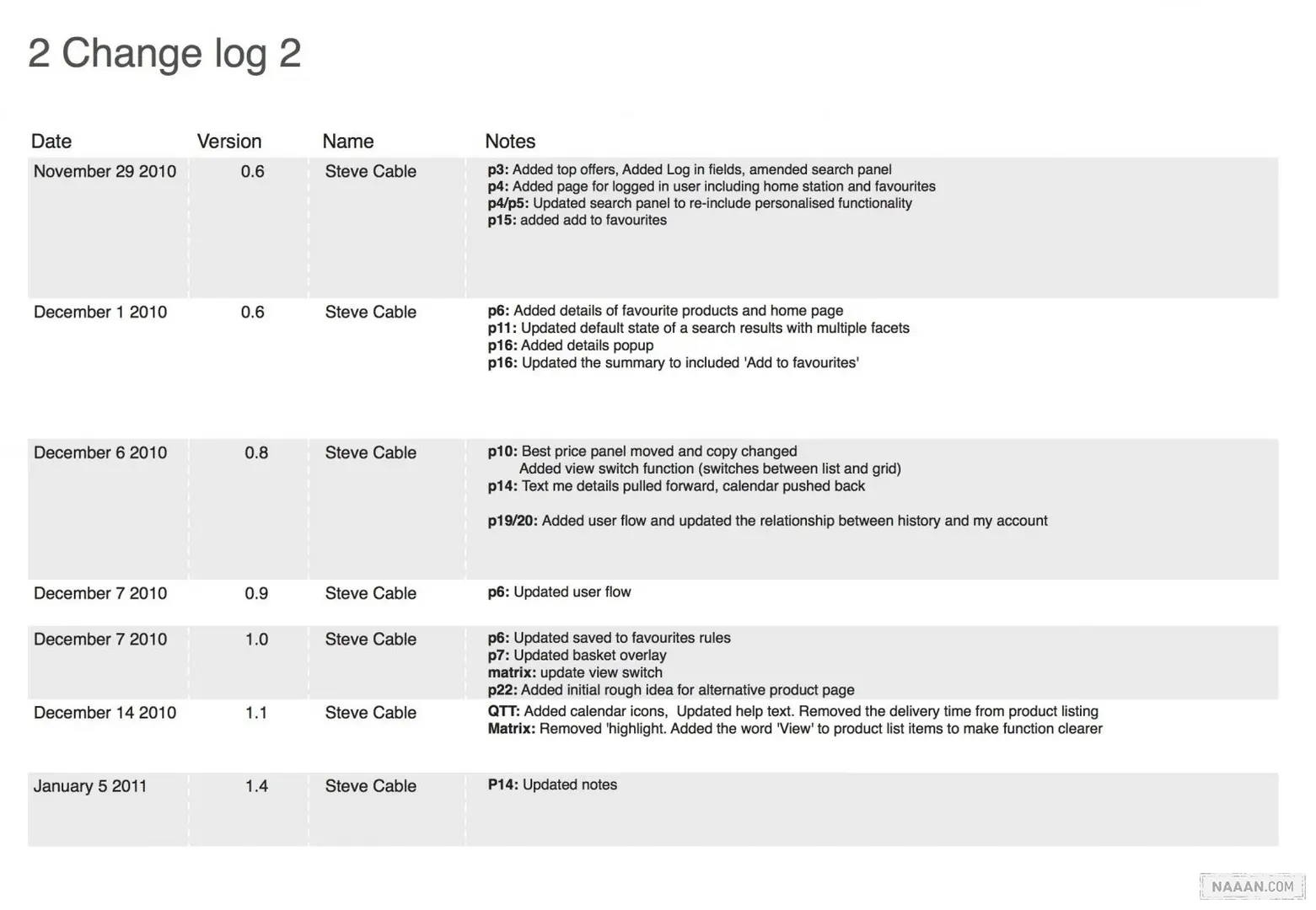 随着迭代的不断进行,每一版线框原型当中的变更通常会越来越细化,从页面结构到模块、控件,这会使跟进后续工作的设计师或开发人员越来越难以发现所有的变化。作为交互设计师,我们有责任创建一份变更日志,并随着项目的发展对其进行持续的更新。日志中的每一条记录都要包含日期、版本号、执行者以及变更说明。这种信息交流的方式不需要花费太多的时间,但结果却是事半功倍的,无论产品人员还是设计师、开发者,大家都可以籍此来一目了然的跟踪原型的版本变化。