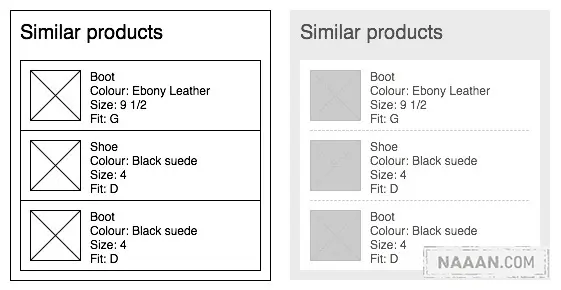 满页面的深色线框会使你的原型看上去缺乏层次、粗糙凌乱。正像我们在第一点当中所说的,试着使用不同明度的灰色作为背景色来界定页面和模块的边缘。这样不仅能表现出界面元素的视觉优先级,而且可以使整个原型看上去更加整洁。如果必须在某些地方使用线条,那么尽量使用纤细的灰色实线或点状线。我们固然不需要让线框原型看上去像视觉稿一样完美,但对这些细节的把握确实可以让它更加简洁精美;在实际工作中,这往往可以提升原型被接纳的程度。