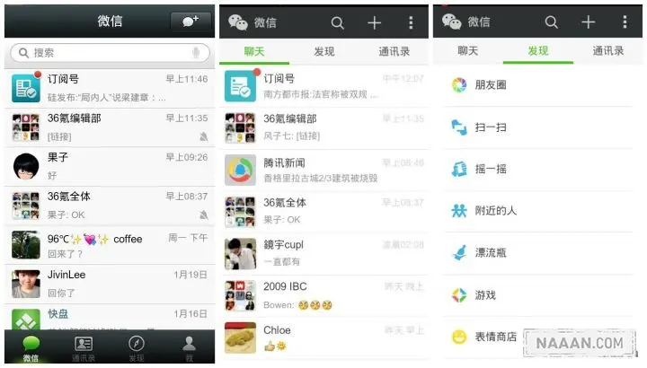 我们来看一下 Android 版微信 5.2。主界面去除了底部的 Tab Bar,在顶部则使用了 Action Bar,并用 Tab Host 来组织内部界面。用户通过手势滑动可以轻松来回切换「聊天」、「发现」、「通讯录」这几个高频功能界面。