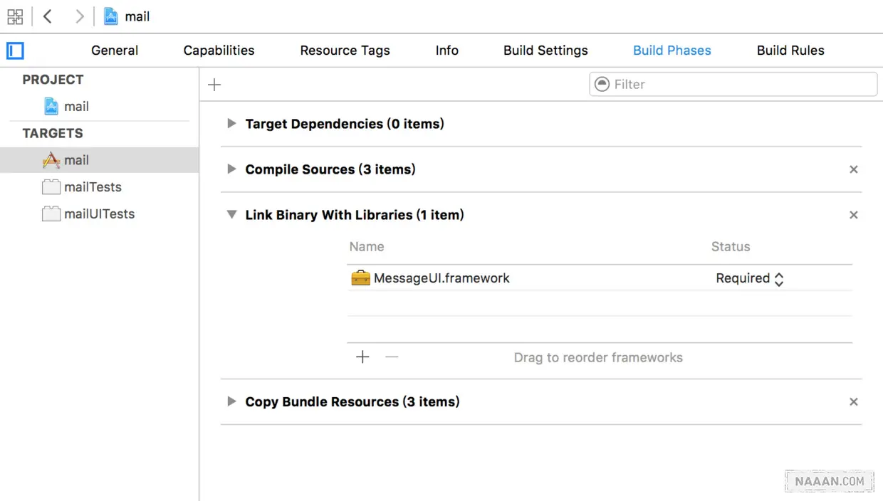 处理完 UITableViewController 以后,就可以开始调用邮件视图了。不过先不急着写代码,首先需要导入框架 MessageUI.framework。在项目设置 Build Phases 的 Link Binary With Libraries 中添加 MessageUI.framework。