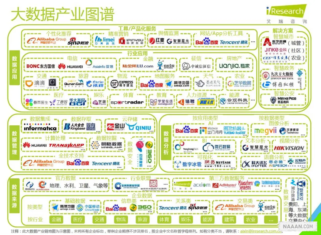 由于中国大数据流通在全社会还未形成规模,目前数据源区块主要集中在政府管理部门、互联网巨头、移动通讯企业等手中,具体有政府数据源提供商、行业数据源提供商、企业数据源提供商、互联网数据源提供商、物联网数据源提供商、移动通讯数据源提供商、第三方数据服务企业等等。
