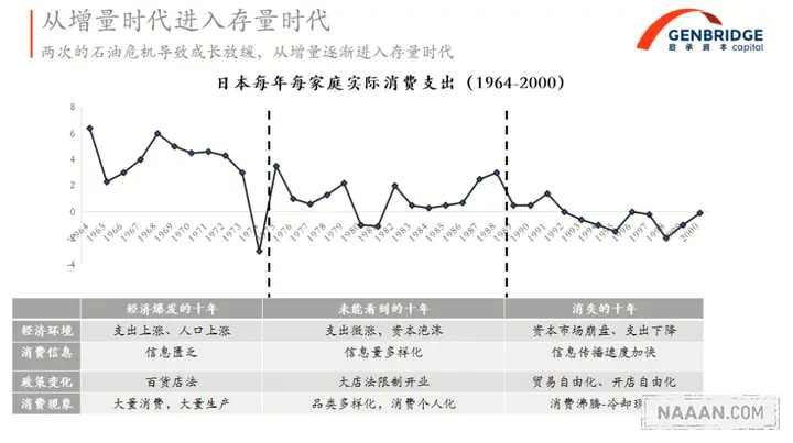 日本 80 年代被人们刻上了「泡沫经济」的烙印,但在泡沫的水面下,已经发生了看不见的变化。泡沫经济推起了房价和股价,高端奢侈品、进口汽车、住房的行情达到了巅峰,但实际上老百姓的消费水平并没有大幅度的提高。1980 年1989 年的十年间,每年每家庭的实际消费支出增速在 2% 左右,远不如上一个十年的 4%5%。