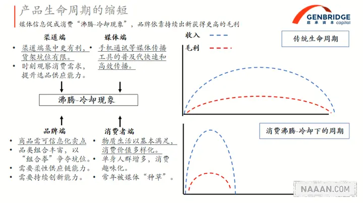 而信息的传播大大缩短了产品的生命周期。一个产品通过某个媒体渠道突然变为话题产品,出现「沸腾现象“,但过了 2 周后热度完全“冷却」。「沸腾 - 冷却」现象的常态化,让很多品牌看到热度急忙投入生产,但等到商品到齐后已经成为了压箱货。