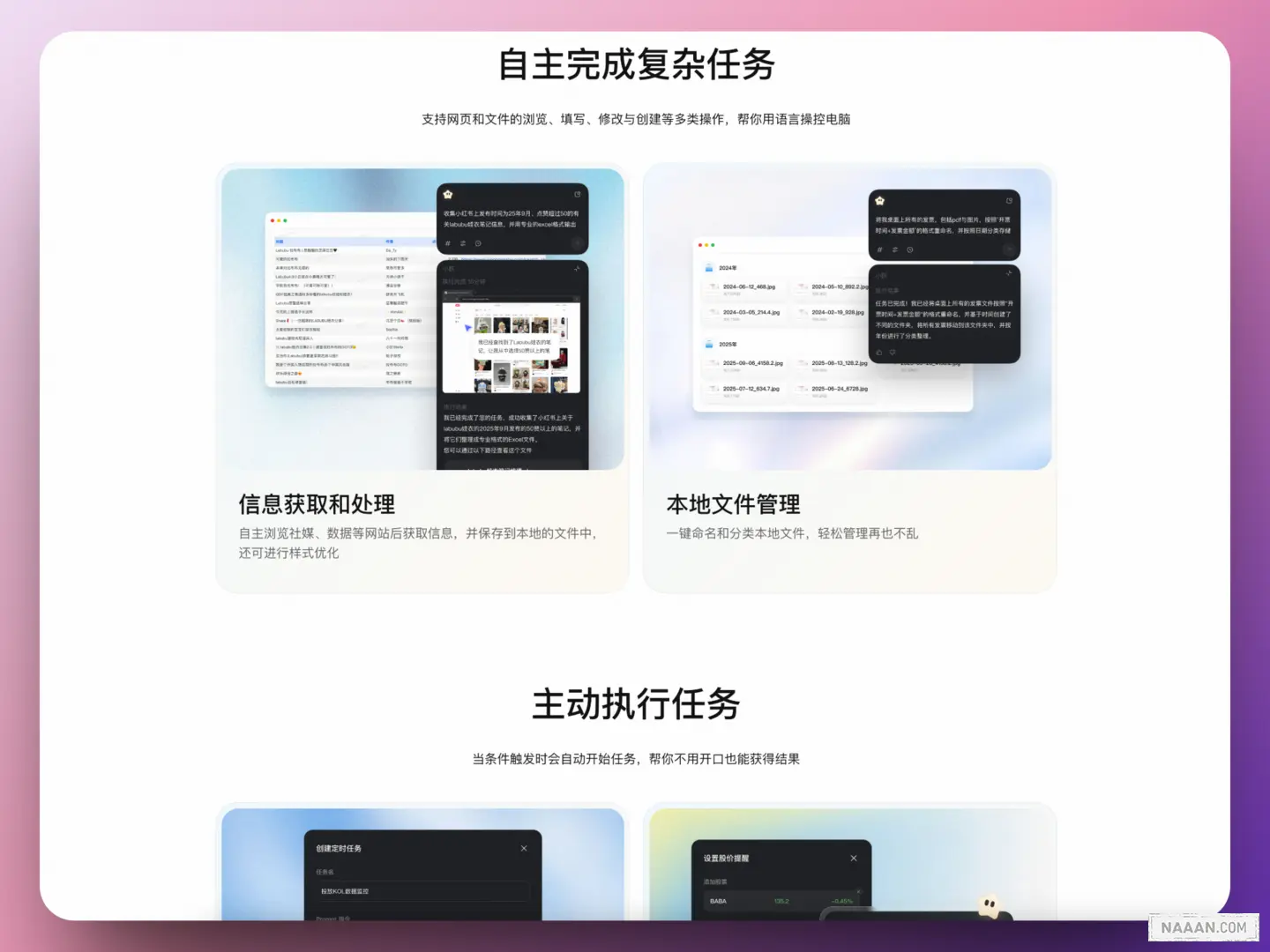能够自主完成各种复杂任务,包括信息获取、文件管理和系统提醒。它支持浏览和编辑网页及本地文件,并能在条件触发时自动执行任务,让用户更高效地工作和生活。即将推出的定期监测和提醒功能,将帮助用户实时掌握重要信息。