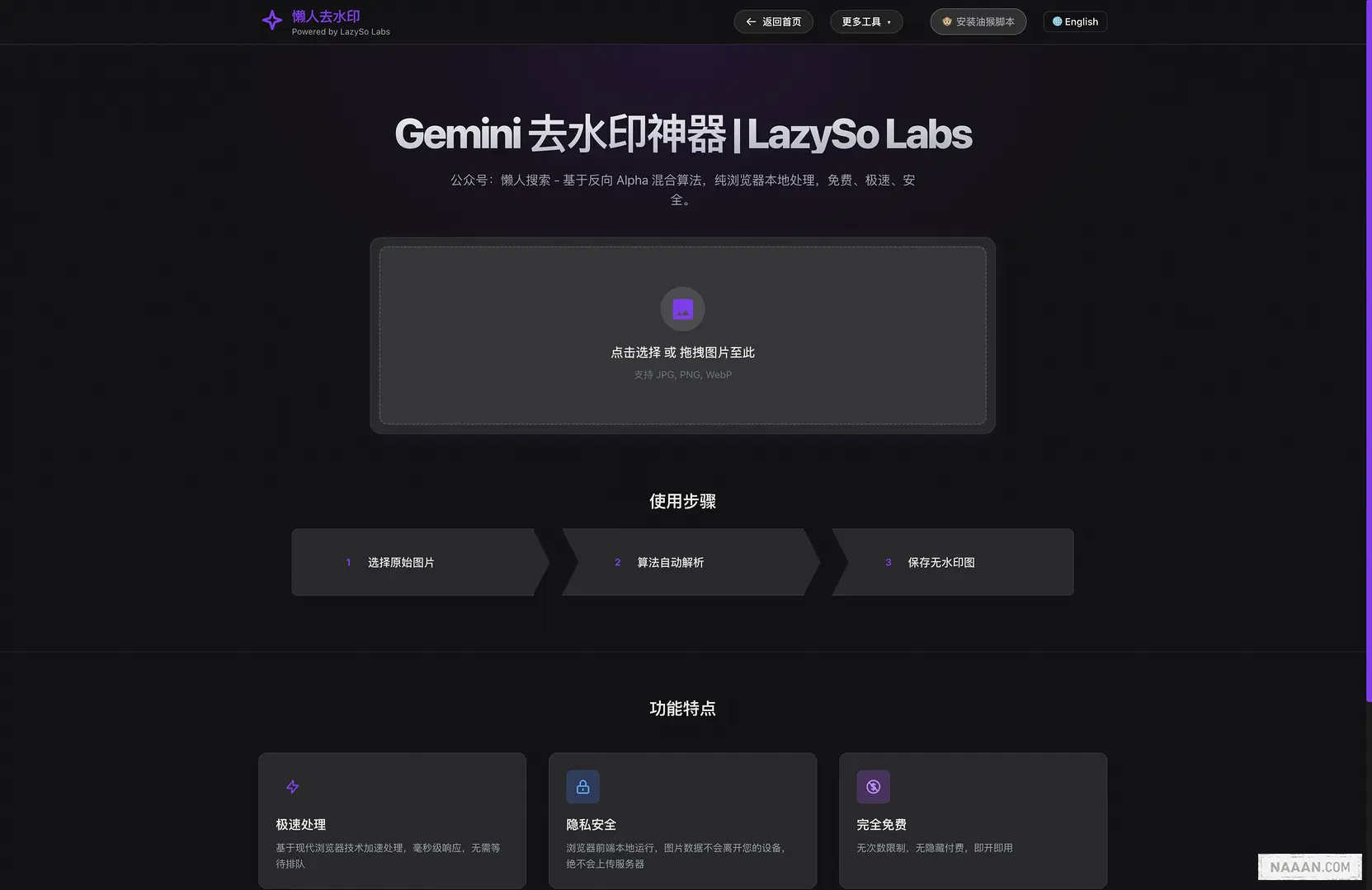 LazySo懒人去水印是一个纯前端_AI去水印工具_。所有处理都在你的浏览器完成,不需要注册,也不需要把文件发往服务器。打开页面、上传图片或 PDF,就能开始工作。